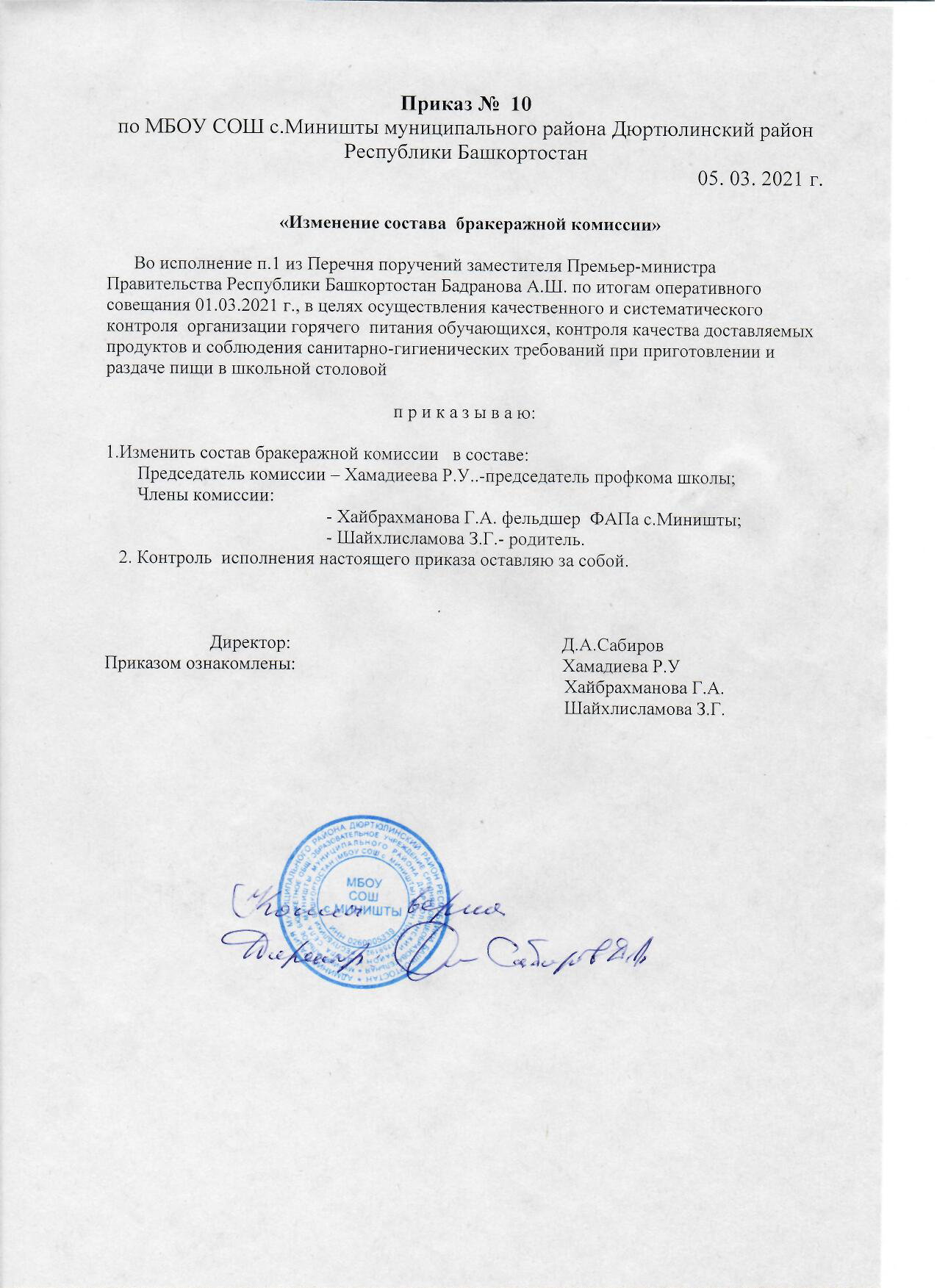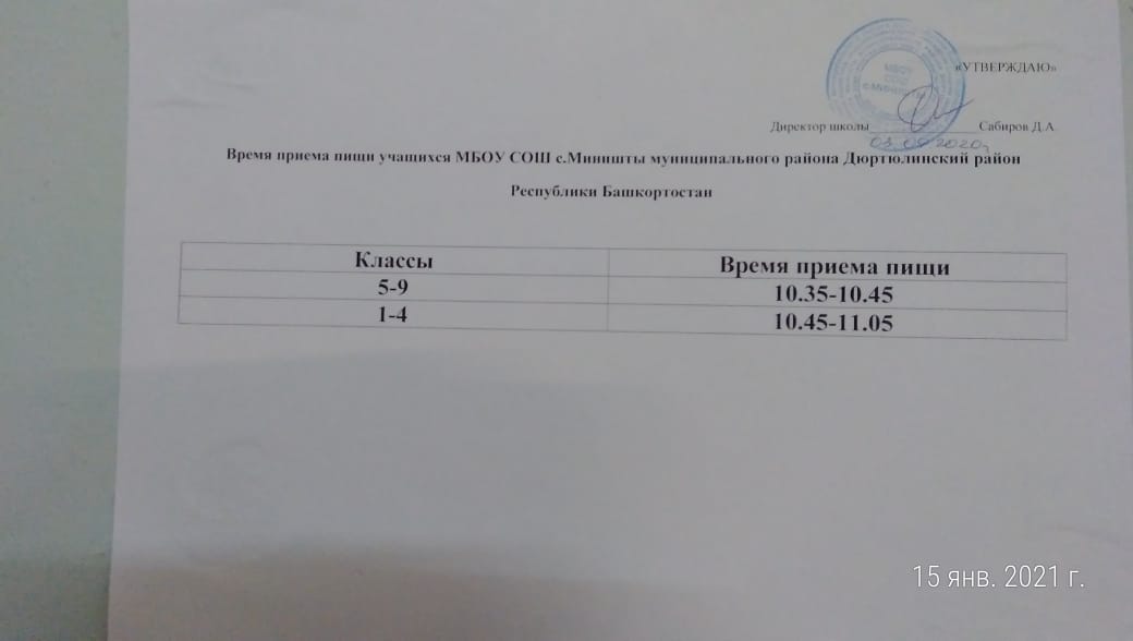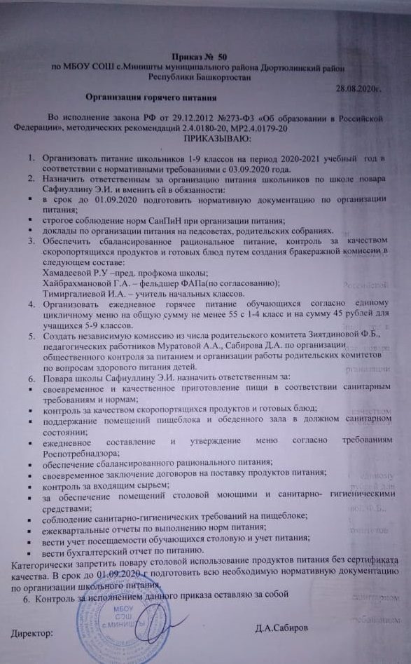 Организатор питания: МБОУ СОШ с. Миништы, директор Сабиров Дамир Амирянович